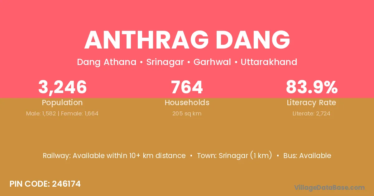 Srinagar (1 km) is the nearest town to Anthrag Dang village for major economic activities and is located approximately 1 km away.