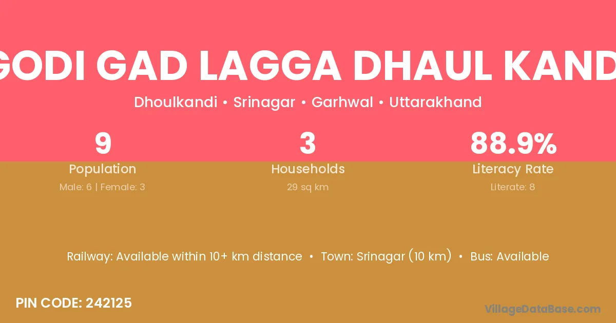 Srinagar (10 km) is the nearest town to Godi Gad Lagga Dhaul Kandi village for major economic activities and is located approximately 10 km away.