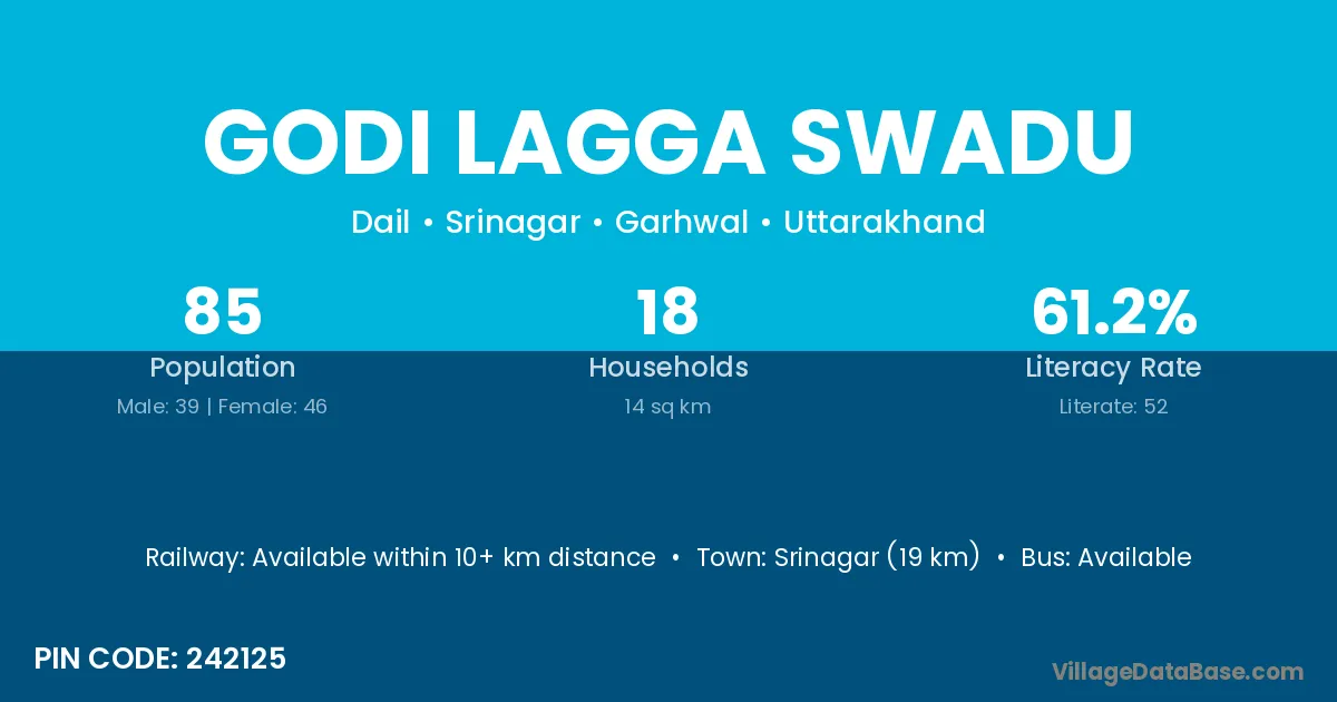 Godi Lagga Swadu village has a total population of 85 people, of which 39 are males and 46 are females.