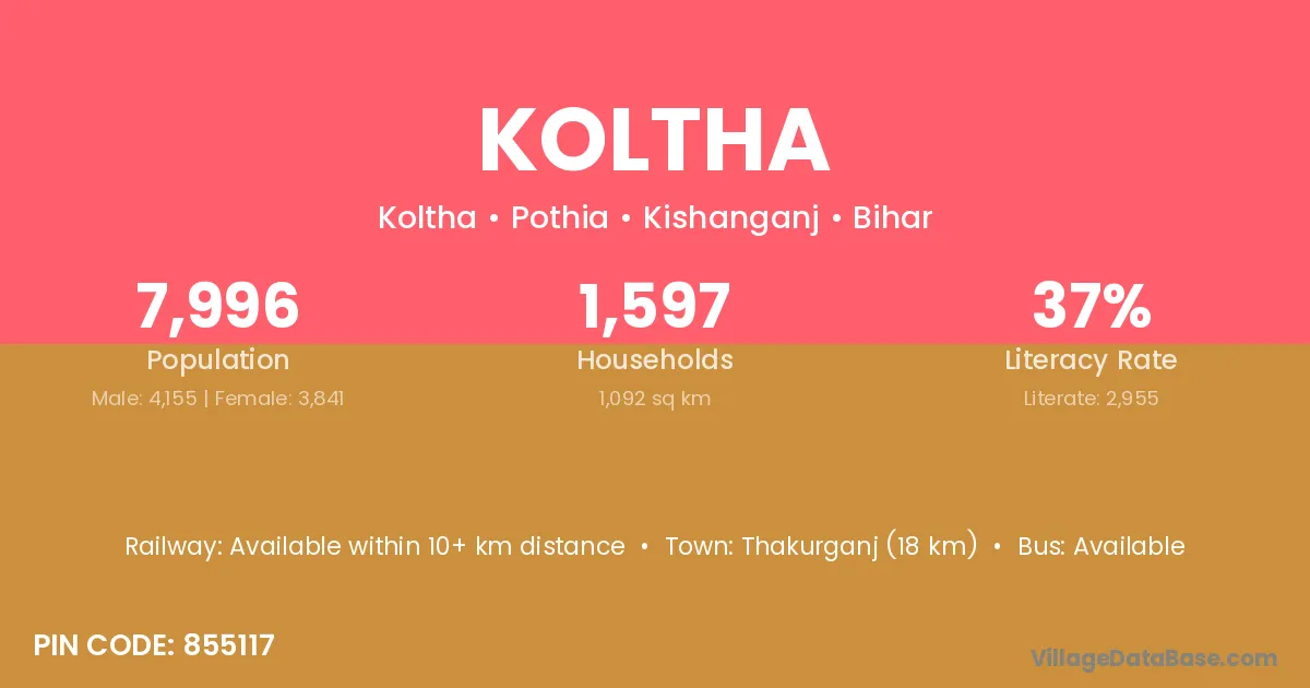 The literacy rate of Koltha village is 76.77%. Male literacy stands at 86.96% and female literacy at 68.60%.