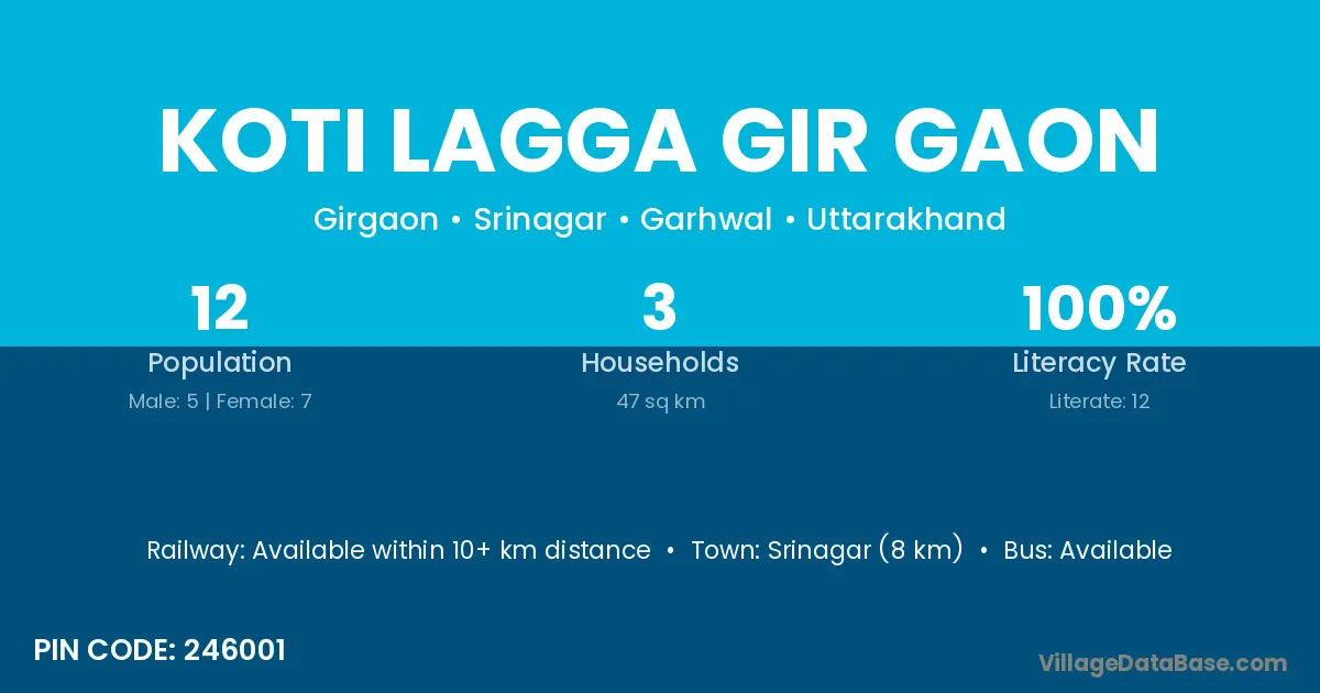 Koti Lagga Gir Gaon village has a total population of 12 people, of which 5 are males and 7 are females.