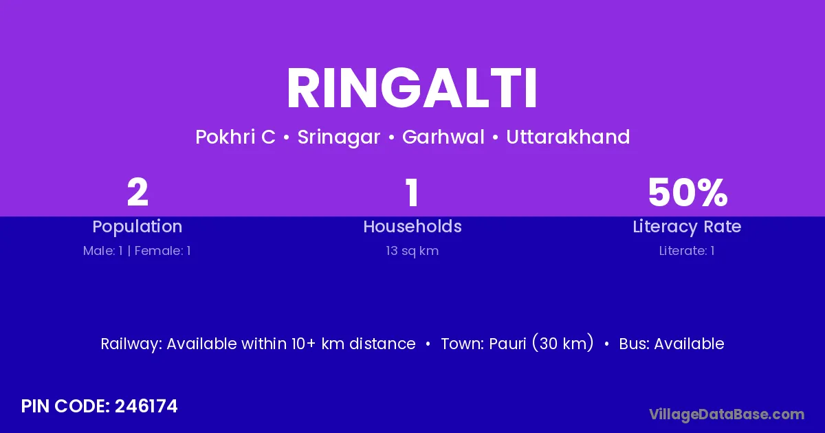 Pauri (30 km) is the nearest town to Ringalti village for major economic activities and is located approximately 30 km away.