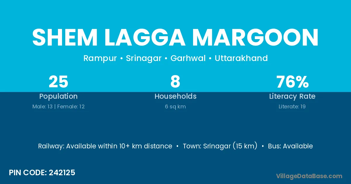 Srinagar (15 km) is the nearest town to Shem Lagga Margoon village for major economic activities and is located approximately 15 km away.