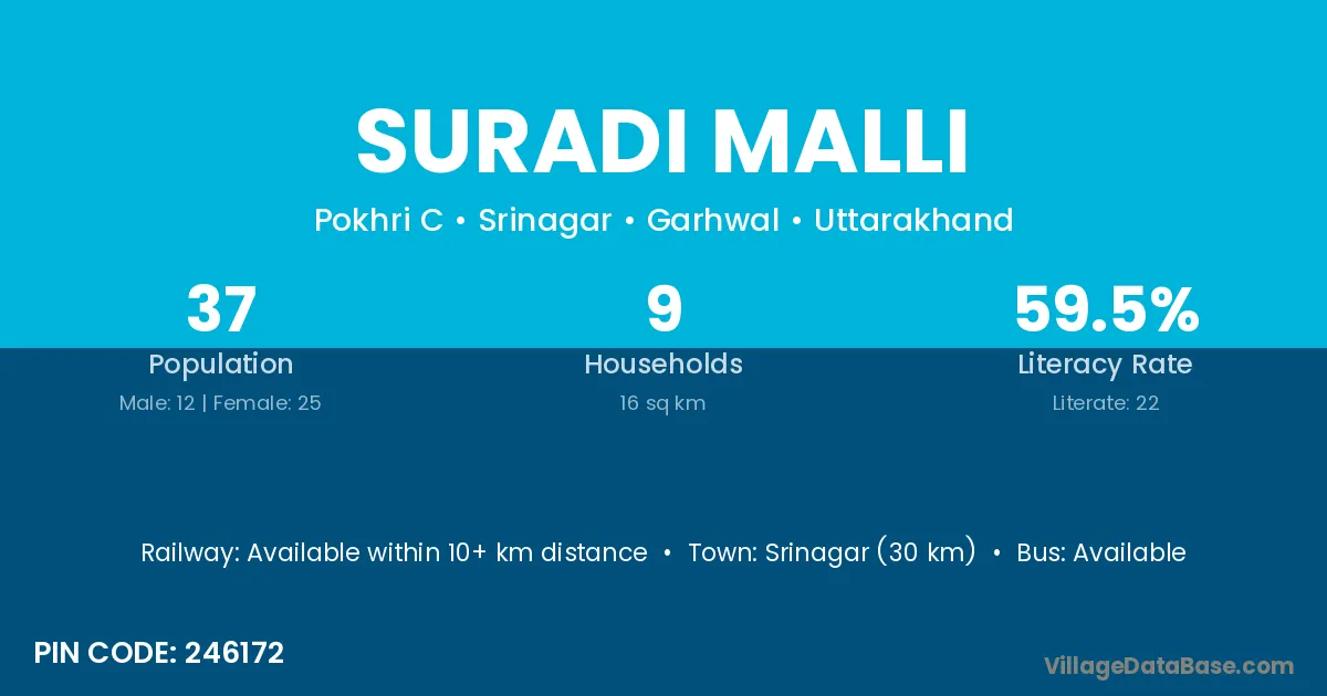 Srinagar (30 km) is the nearest town to Suradi Malli village for major economic activities and is located approximately 30 km away.