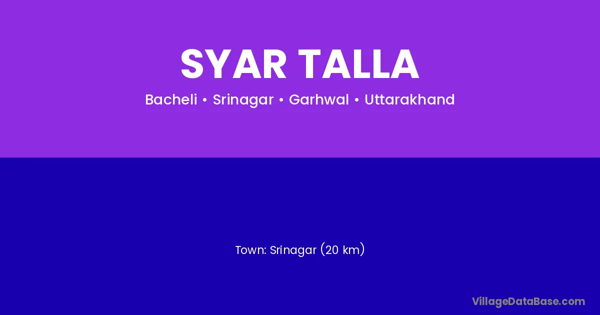 Srinagar (20 km) is the nearest town to Syar Talla village for major economic activities and is located approximately 20 km away.