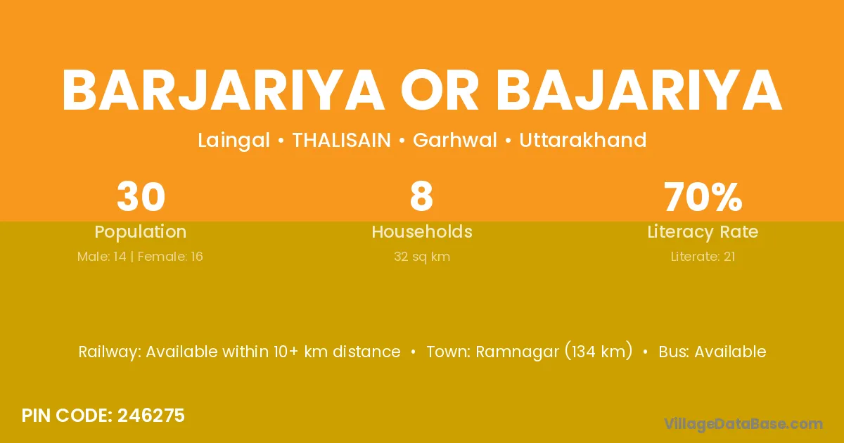 Barjariya Or Bajariya village is located in the THALISAIN Tehsil of the Garhwal district in Uttarakhand .