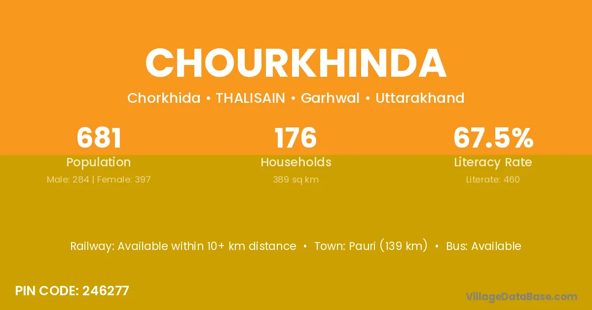 Pauri (139 km) is the nearest town to Chourkhinda village for major economic activities and is located approximately 139 km away.