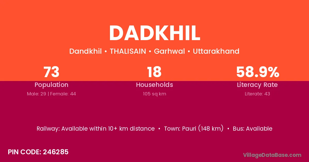 Pauri (148 km) is the nearest town to Dadkhil village for major economic activities and is located approximately 148 km away.