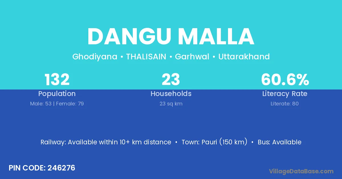 Pauri (150 km) is the nearest town to Dangu Malla village for major economic activities and is located approximately 150 km away.