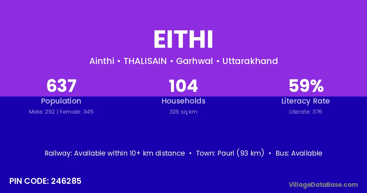 Pauri (93 km) is the nearest town to Eithi village for major economic activities and is located approximately 93 km away.