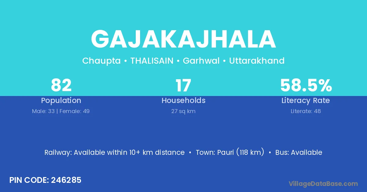 Pauri (118 km) is the nearest town to Gajakajhala village for major economic activities and is located approximately 118 km away.