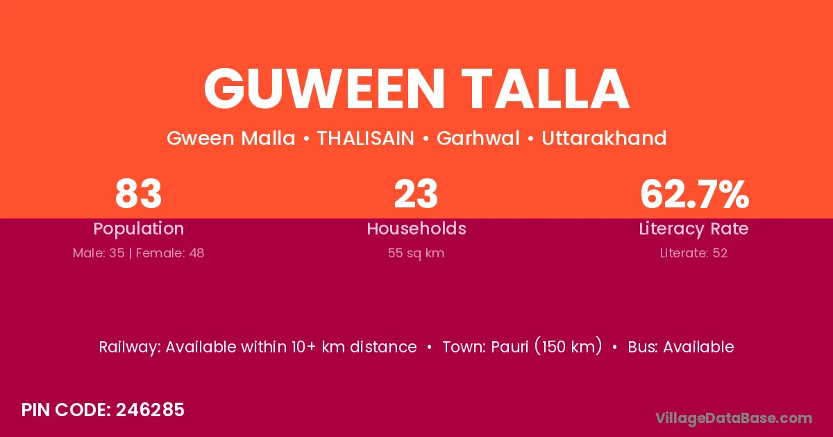 Pauri (150 km) is the nearest town to Guween Talla village for major economic activities and is located approximately 150 km away.