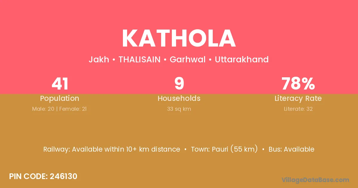 Pauri (55 km) is the nearest town to Kathola village for major economic activities and is located approximately 55 km away.