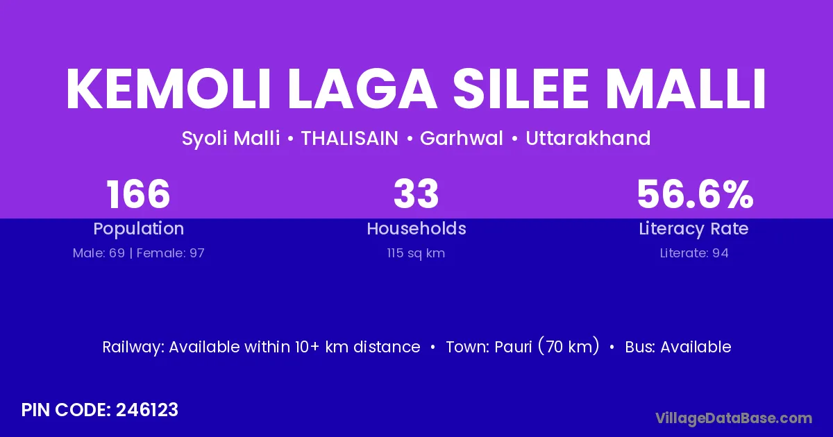 Pauri (70 km) is the nearest town to Kemoli Laga Silee Malli village for major economic activities and is located approximately 70 km away.