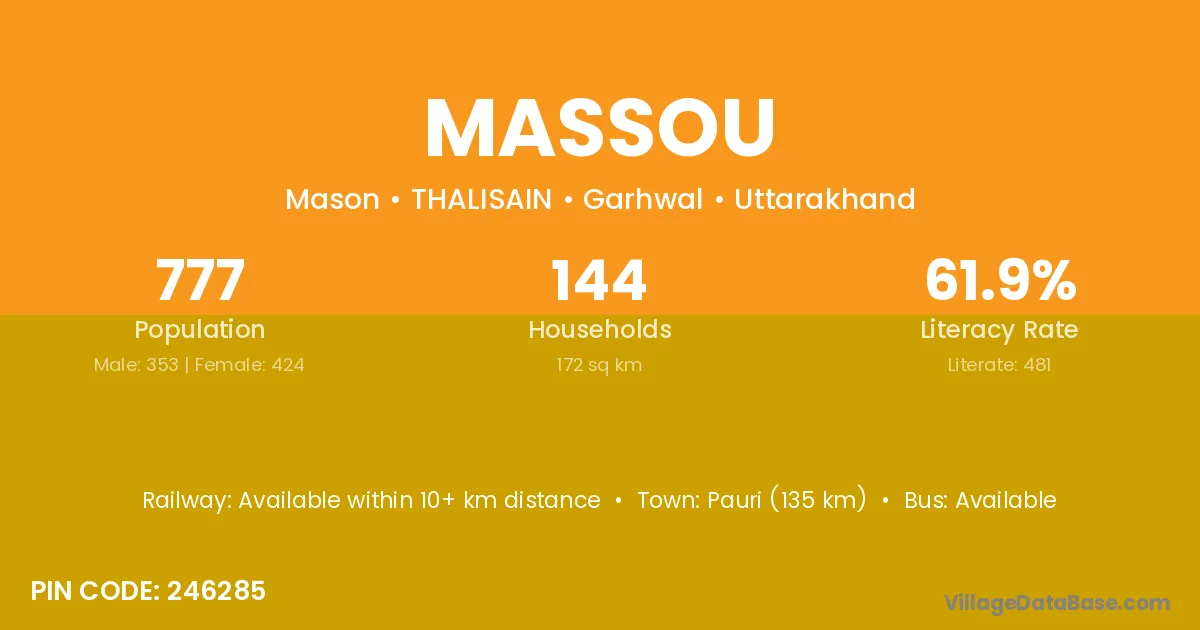 Pauri (135 km) is the nearest town to Massou village for major economic activities and is located approximately 135 km away.