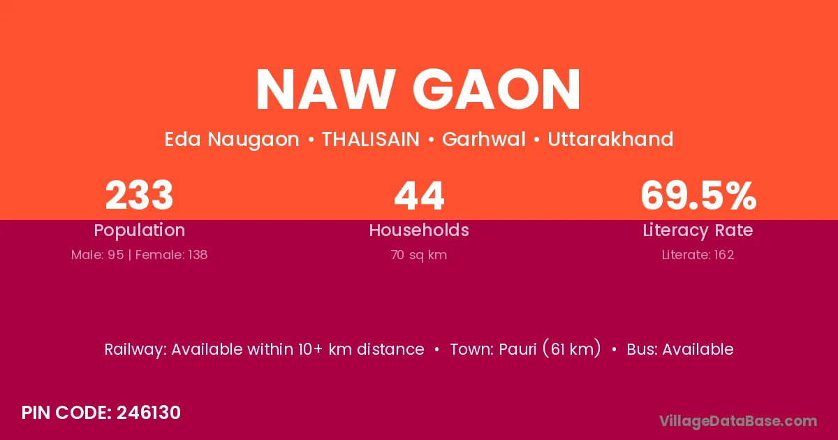 Pauri (61 km) is the nearest town to Naw Gaon village for major economic activities and is located approximately 61 km away.