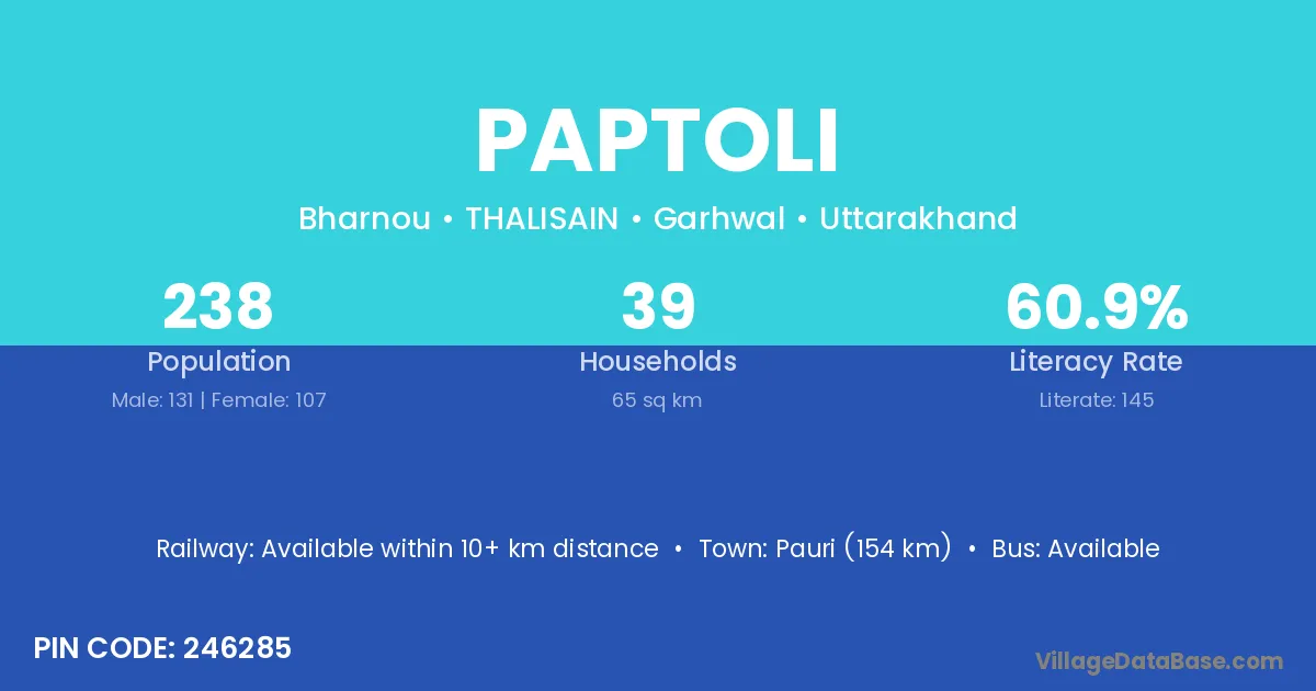 Pauri (154 km) is the nearest town to Paptoli village for major economic activities and is located approximately 154 km away.