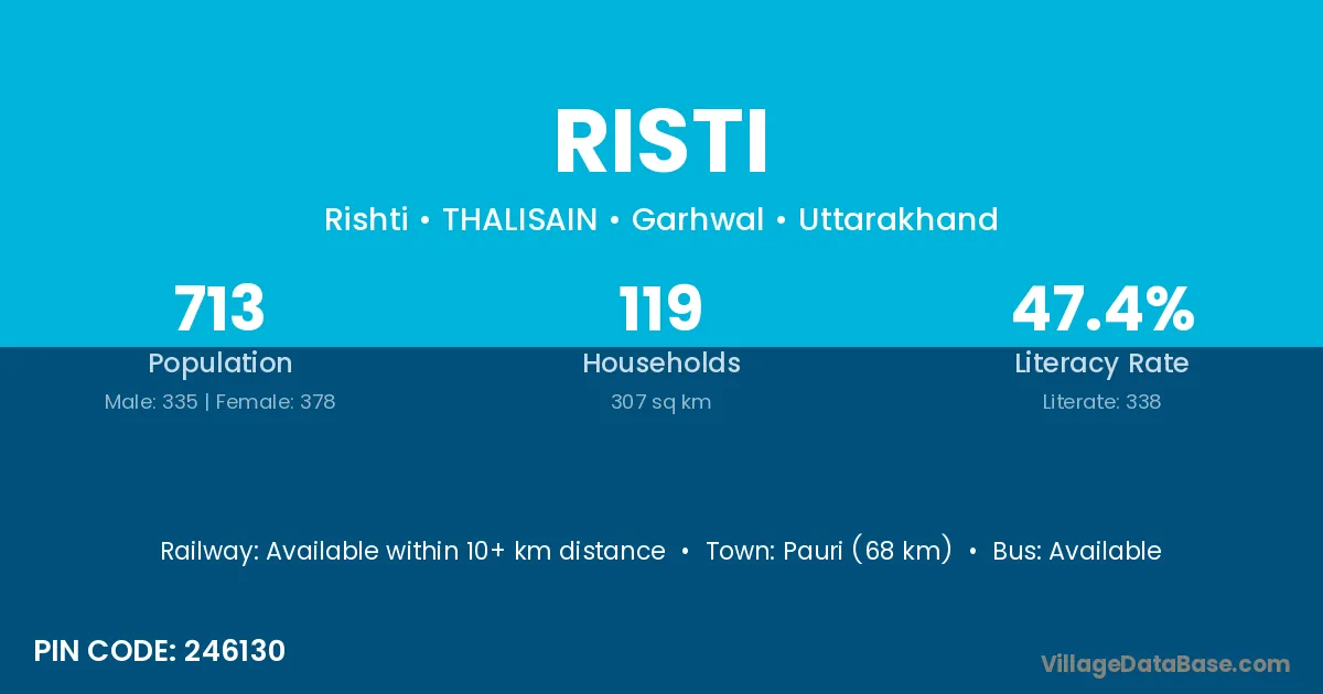 Risti village has a total population of 713 people, of which 335 are males and 378 are females.