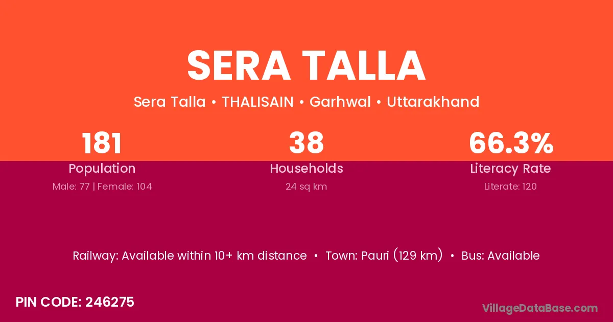 Pauri (129 km) is the nearest town to Sera Talla village for major economic activities and is located approximately 129 km away.