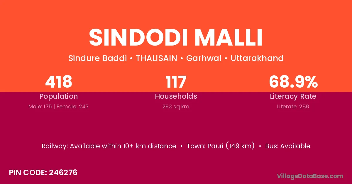 Pauri (149 km) is the nearest town to Sindodi Malli village for major economic activities and is located approximately 149 km away.