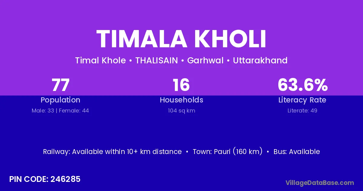 Pauri (160 km) is the nearest town to Timala Kholi village for major economic activities and is located approximately 160 km away.