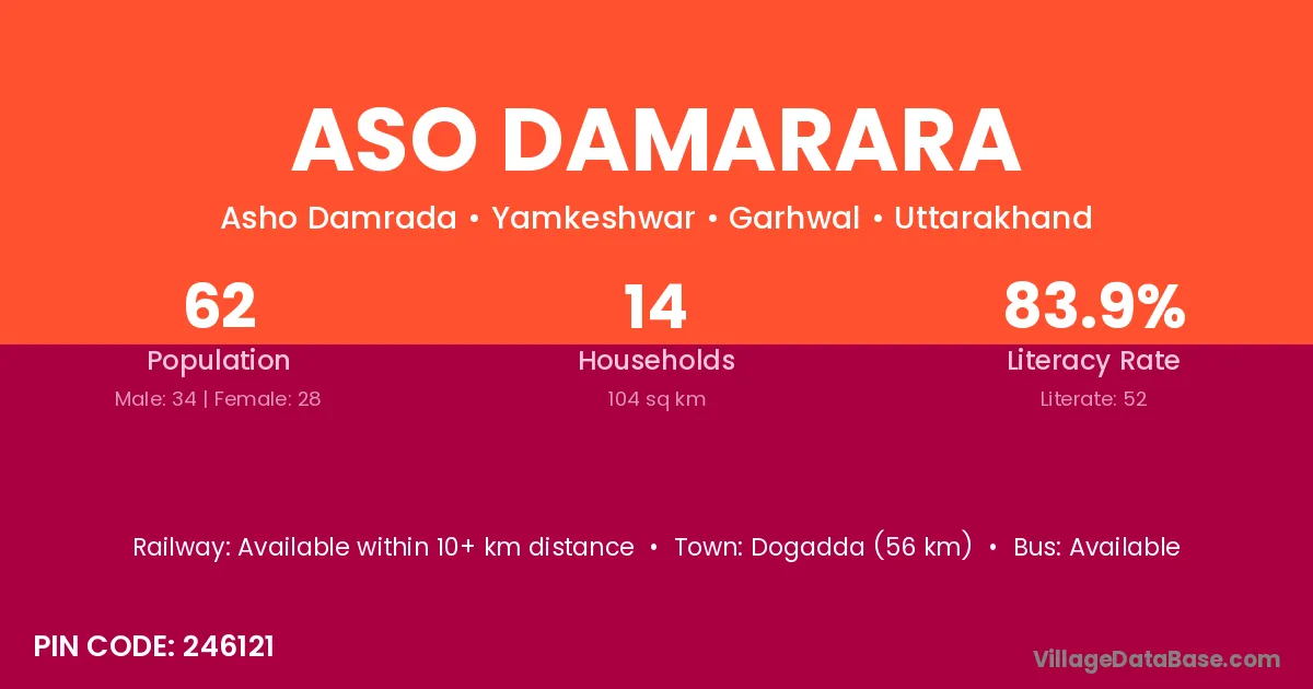 Dogadda (56 km) is the nearest town to Aso Damarara village for major economic activities and is located approximately 56 km away.