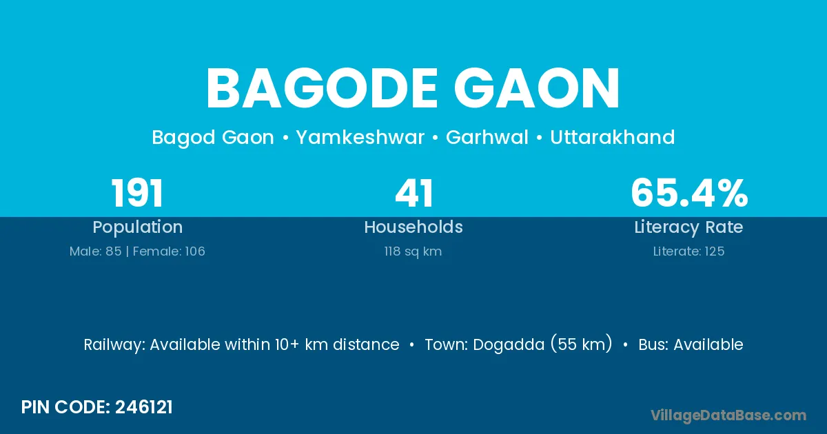 Dogadda (55 km) is the nearest town to Bagode Gaon village for major economic activities and is located approximately 55 km away.