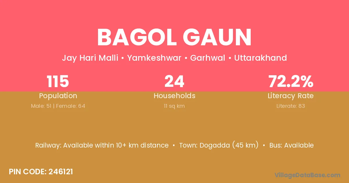Dogadda (45 km) is the nearest town to Bagol Gaun village for major economic activities and is located approximately 45 km away.