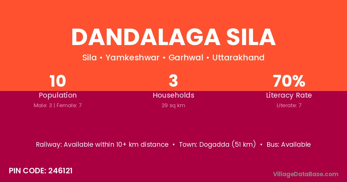 Dogadda (51 km) is the nearest town to Dandalaga Sila village for major economic activities and is located approximately 51 km away.