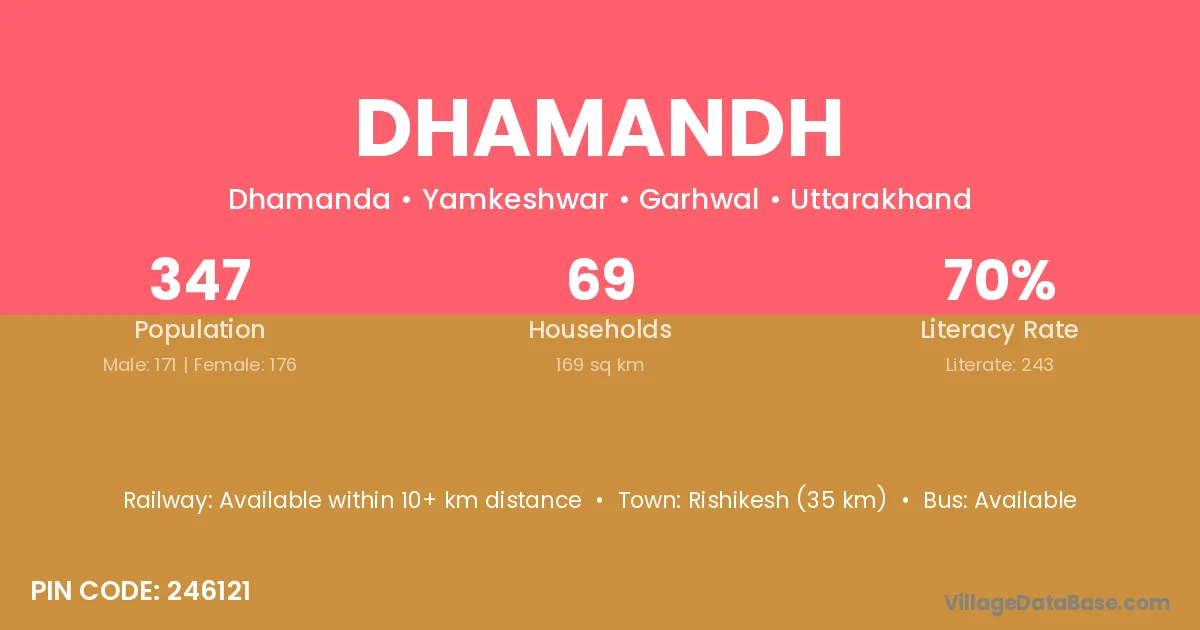 Rishikesh (35 km) is the nearest town to Dhamandh village for major economic activities and is located approximately 35 km away.