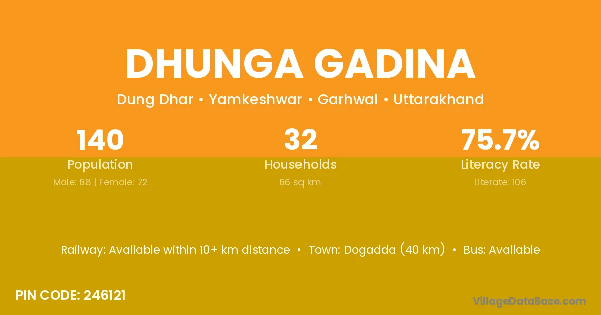 Dogadda (40 km) is the nearest town to Dhunga Gadina village for major economic activities and is located approximately 40 km away.