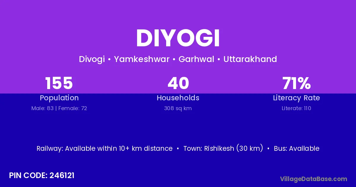 Rishikesh (30 km) is the nearest town to Diyogi village for major economic activities and is located approximately 30 km away.