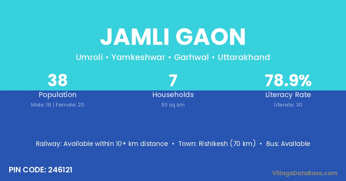 Rishikesh (70 km) is the nearest town to Jamli Gaon village for major economic activities and is located approximately 70 km away.