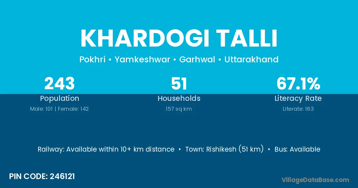 Rishikesh (51 km) is the nearest town to Khardogi Talli village for major economic activities and is located approximately 51 km away.