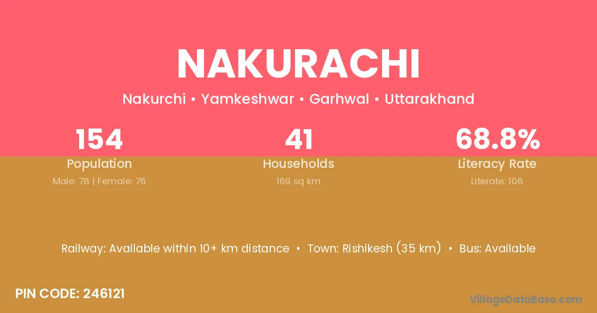 Rishikesh (35 km) is the nearest town to Nakurachi village for major economic activities and is located approximately 35 km away.