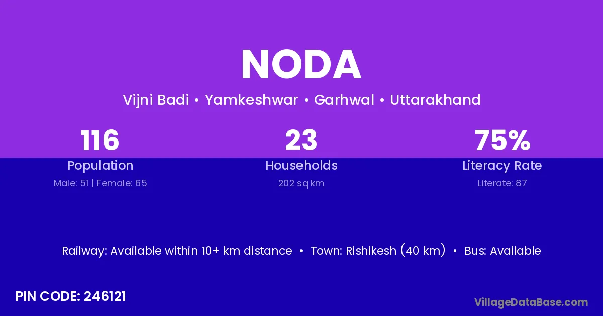 Rishikesh (40 km) is the nearest town to Noda village for major economic activities and is located approximately 40 km away.