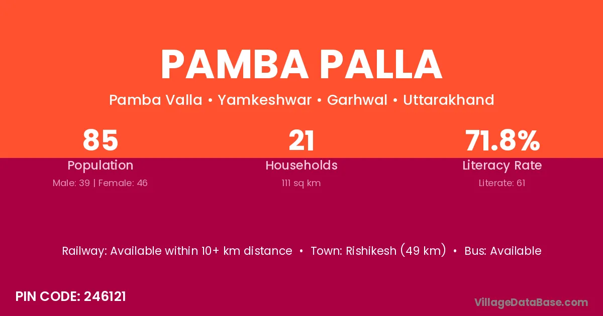 Rishikesh (49 km) is the nearest town to Pamba Palla village for major economic activities and is located approximately 49 km away.