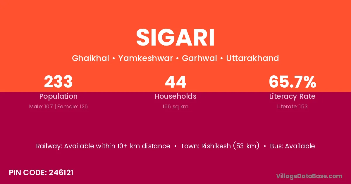 Rishikesh (53 km) is the nearest town to Sigari village for major economic activities and is located approximately 53 km away.