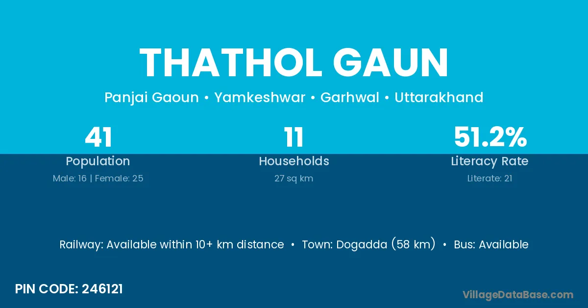 Dogadda (58 km) is the nearest town to Thathol Gaun village for major economic activities and is located approximately 58 km away.