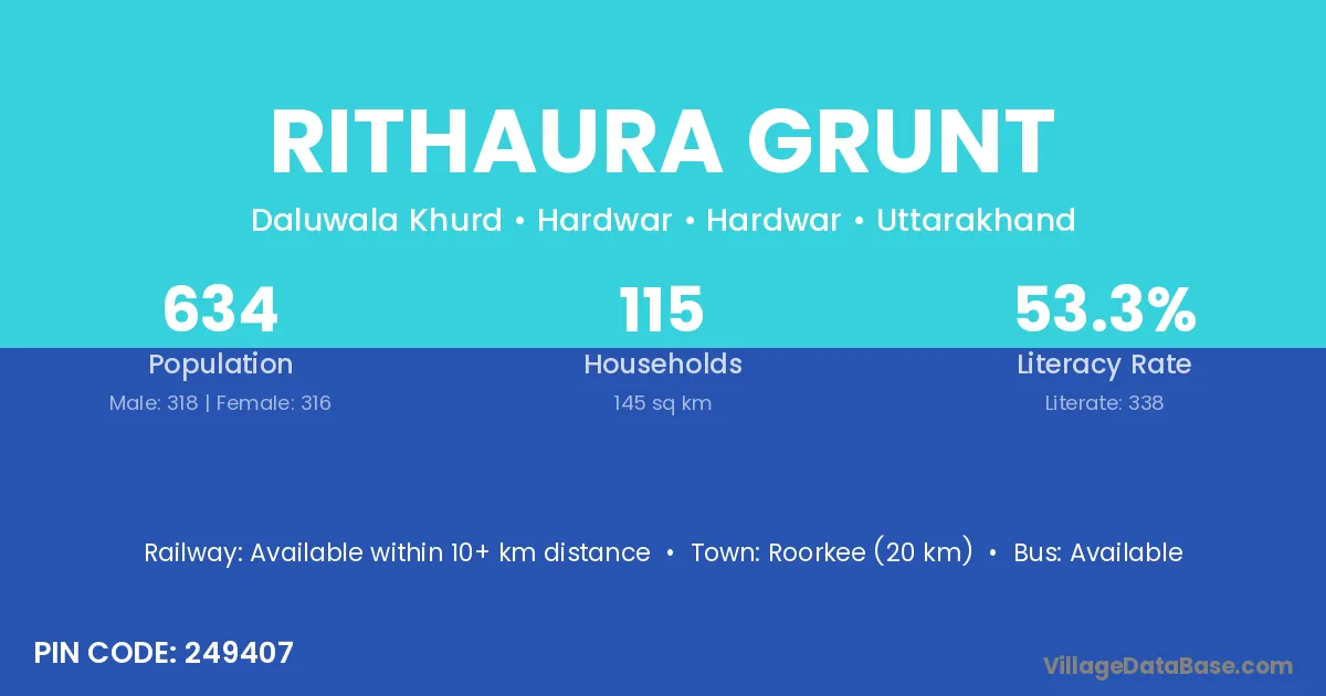 Roorkee (20 km) is the nearest town to Rithaura Grunt village for major economic activities and is located approximately 20 km away.