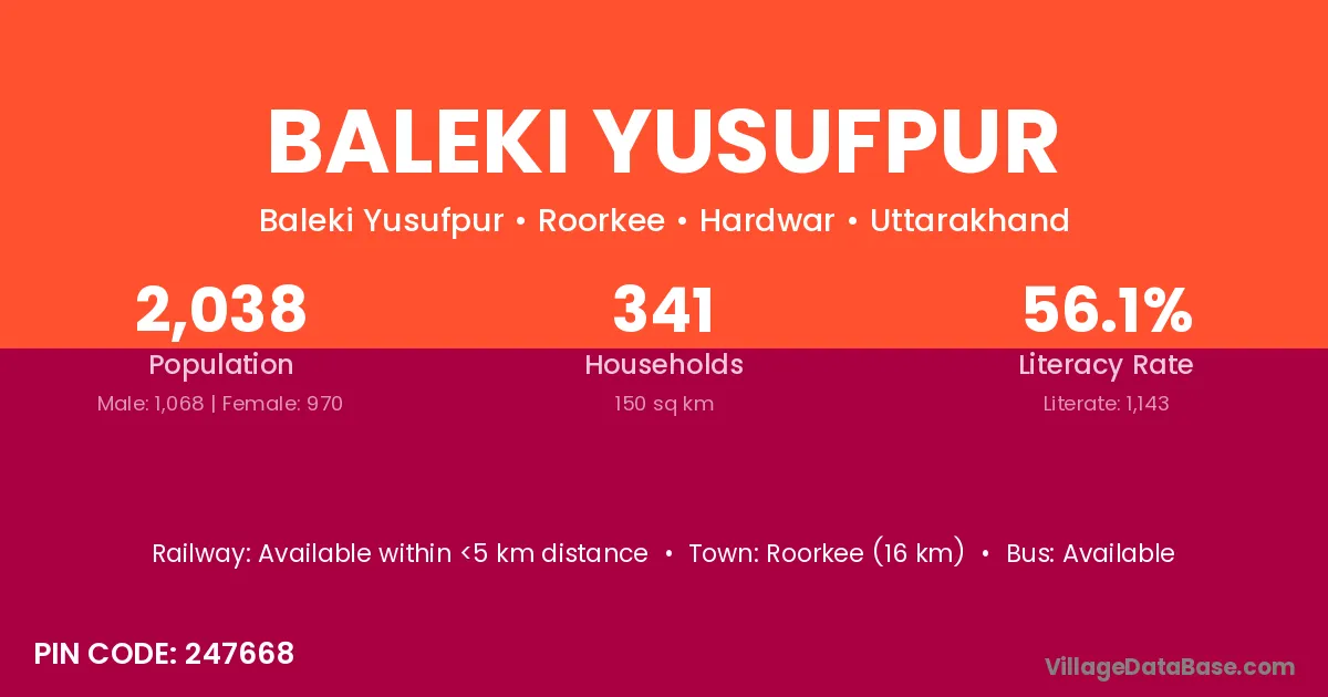Roorkee (16 km) is the nearest town to Baleki Yusufpur village for major economic activities and is located approximately 16 km away.