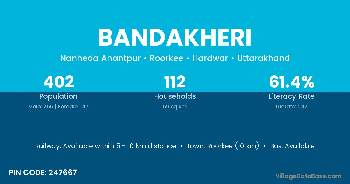 Roorkee (10 km) is the nearest town to Bandakheri village for major economic activities and is located approximately 10 km away.