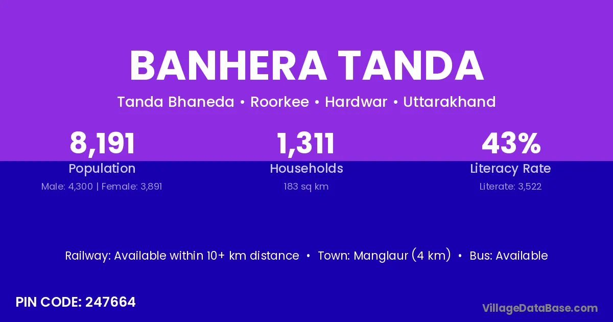 Manglaur (4 km) is the nearest town to Banhera Tanda village for major economic activities and is located approximately 4 km away.