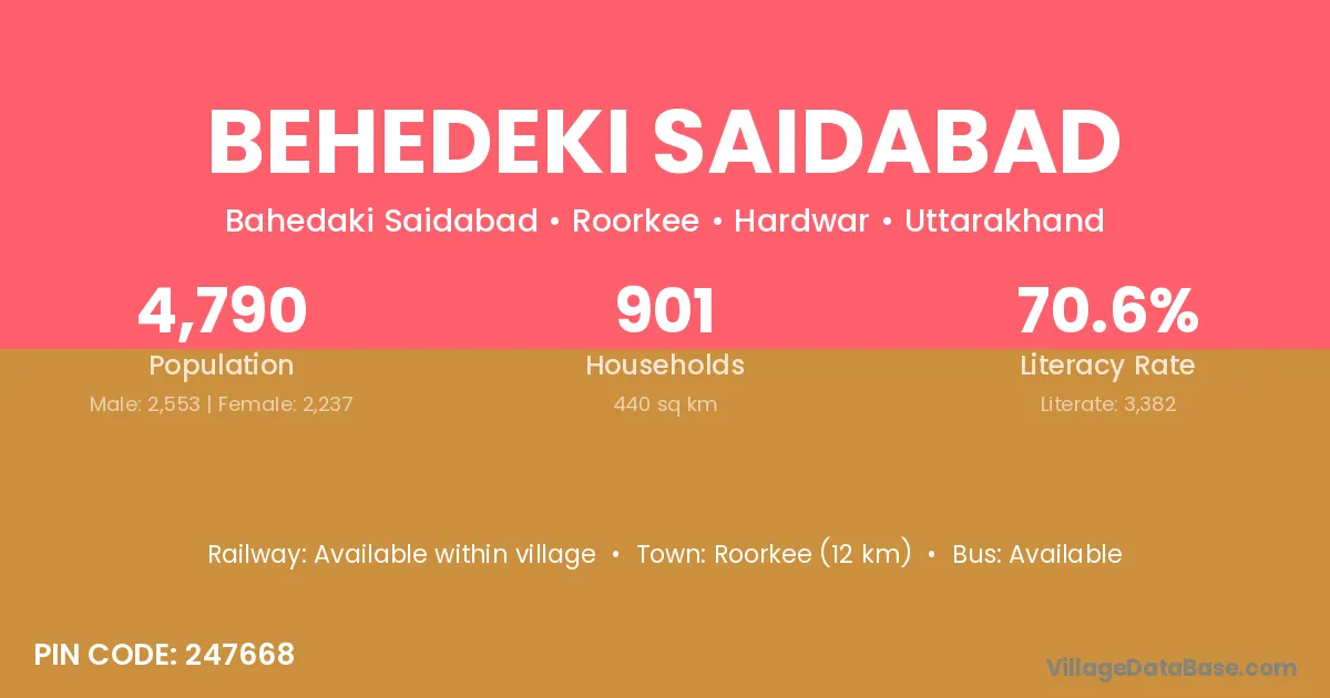 Roorkee (12 km) is the nearest town to Behedeki Saidabad village for major economic activities and is located approximately 12 km away.