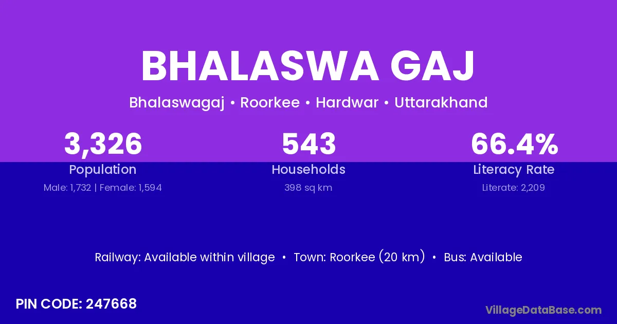 Roorkee (20 km) is the nearest town to Bhalaswa Gaj village for major economic activities and is located approximately 20 km away.