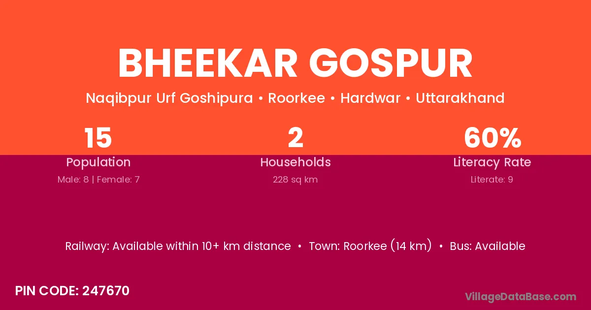 Roorkee (14 km) is the nearest town to Bheekar Gospur village for major economic activities and is located approximately 14 km away.