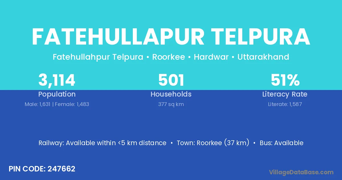 Roorkee (37 km) is the nearest town to Fatehullapur Telpura village for major economic activities and is located approximately 37 km away.