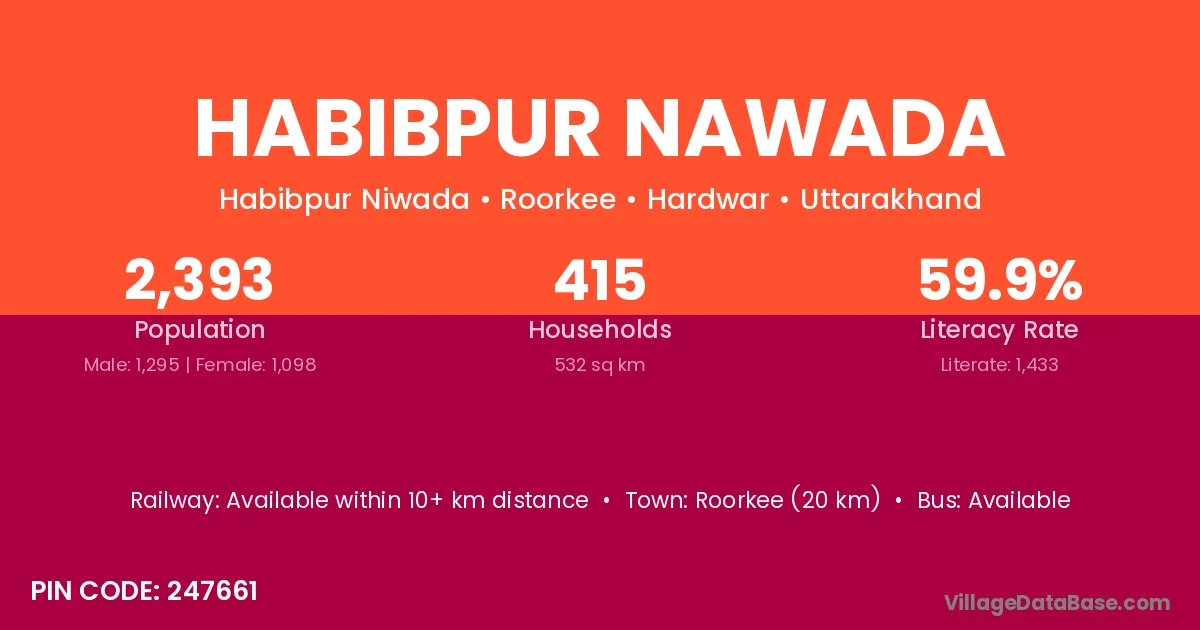 Roorkee (20 km) is the nearest town to Habibpur Nawada village for major economic activities and is located approximately 20 km away.