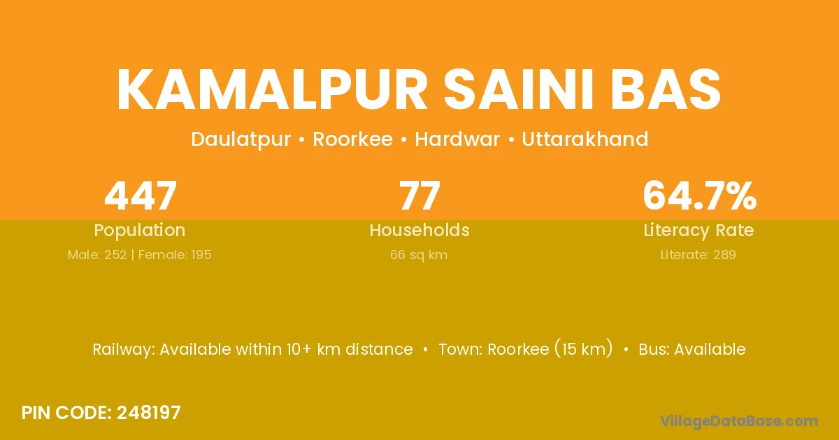 Roorkee (15 km) is the nearest town to Kamalpur Saini Bas village for major economic activities and is located approximately 15 km away.
