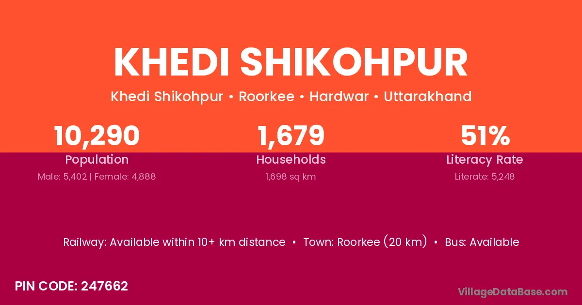 Roorkee (20 km) is the nearest town to Khedi Shikohpur village for major economic activities and is located approximately 20 km away.